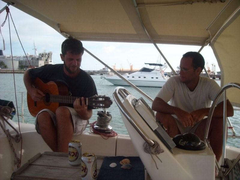 Sporadische Bordparty. Wir laden Clement ein und schon greift der Franzose in die Saiten.