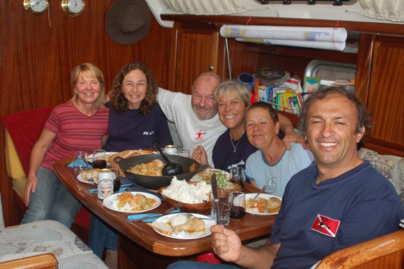 Sonntagsessen bei uns an Bord mit den deutschen Seglern Annemarie und Werner und der Crew der argentinischen "Shipping".