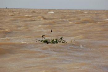 Auf dem Rio de la Plata - gigantische Größe, aber nicht wirklich ein "Silberfluss". Auf dem trüben Wasser fallen die grünen Pflanzen-Inseln besonders auf.
