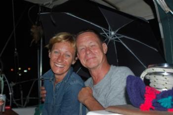Gut geschützt: Marion und Friedrich - Regenschirmparty an Bord der EDEN.