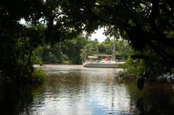 Flussafwärts ins Landesinnere - und wir finden ehemalige Plantagen, später nur noch undurchdringliche Natur. Wir ankern vor einem Papageienwald und dann im Nirgendwo. Grüne Hölle pur!