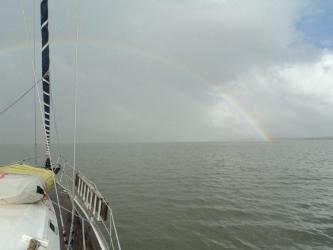Regenbogen von einem Ufer zum anderen - extra gespannt für unseren Abschied von Surinam. Darunter hindurch fahren wir auf´s weite Meer!