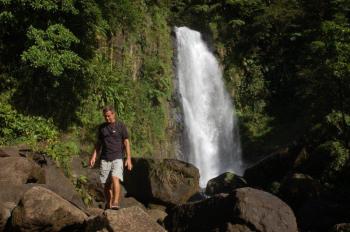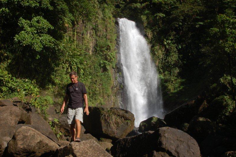 Wasserfälle im Regenwald - an den Trafalgar Falls. Kühl fallen sie die Felsen hinab, gleich daneben gibt es heiße Quellen..