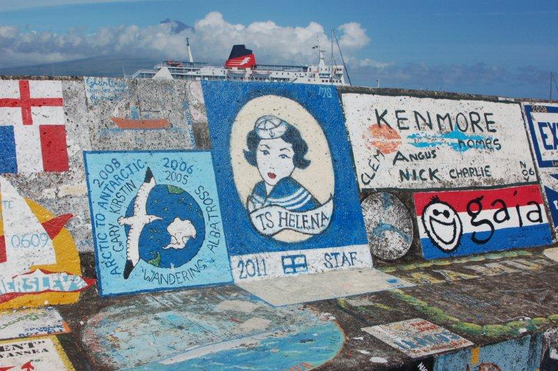 Horta ist der Treffpunkt der Seglerwelt schlechthin - wer die Welt umrundet oder im Atlantik segelt, kommt irgendwann garantiert hier vorbei. wir lassen uns einfach von der Atmosphäre dieses Ortes anstecken, versäumen es auch nicht, im berühmten Café Sport einzukehren und tun was alle Segler machen:: Wir malen unser Logo als Glücksbringer an die kullerbunte Hafenmole!