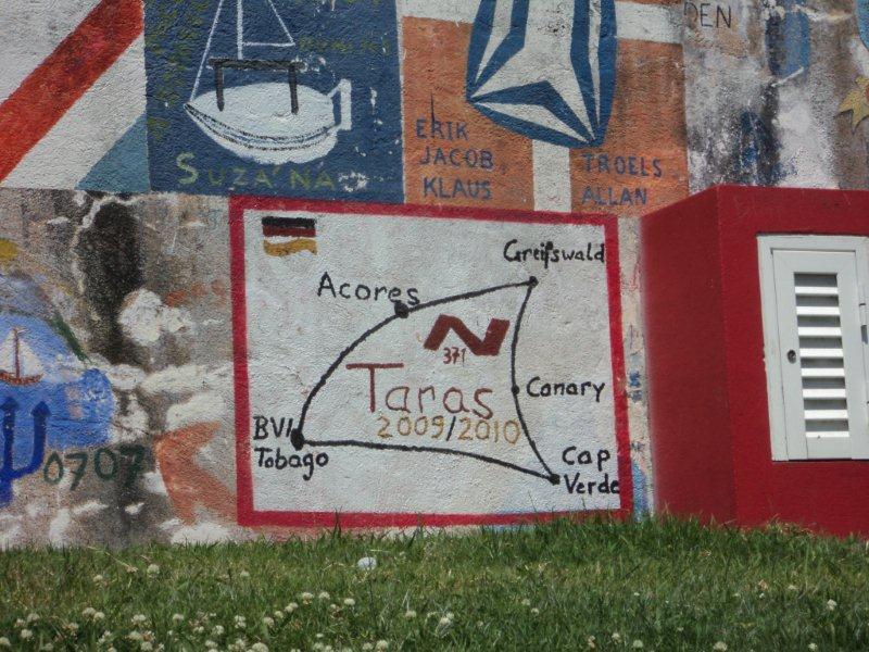 Horta ist der Treffpunkt der Seglerwelt schlechthin - wer die Welt umrundet oder im Atlantik segelt, kommt irgendwann garantiert hier vorbei. wir lassen uns einfach von der Atmosphäre dieses Ortes anstecken, versäumen es auch nicht, im berühmten Café Sport einzukehren und tun was alle Segler machen:: Wir malen unser Logo als Glücksbringer an die kullerbunte Hafenmole!