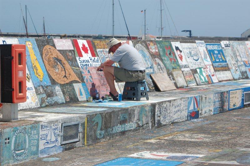 Horta ist der Treffpunkt der Seglerwelt schlechthin - wer die Welt umrundet oder im Atlantik segelt, kommt irgendwann garantiert hier vorbei. wir lassen uns einfach von der Atmosphäre dieses Ortes anstecken, versäumen es auch nicht, im berühmten Café Sport einzukehren und tun was alle Segler machen:: Wir malen unser Logo als Glücksbringer an die kullerbunte Hafenmole!