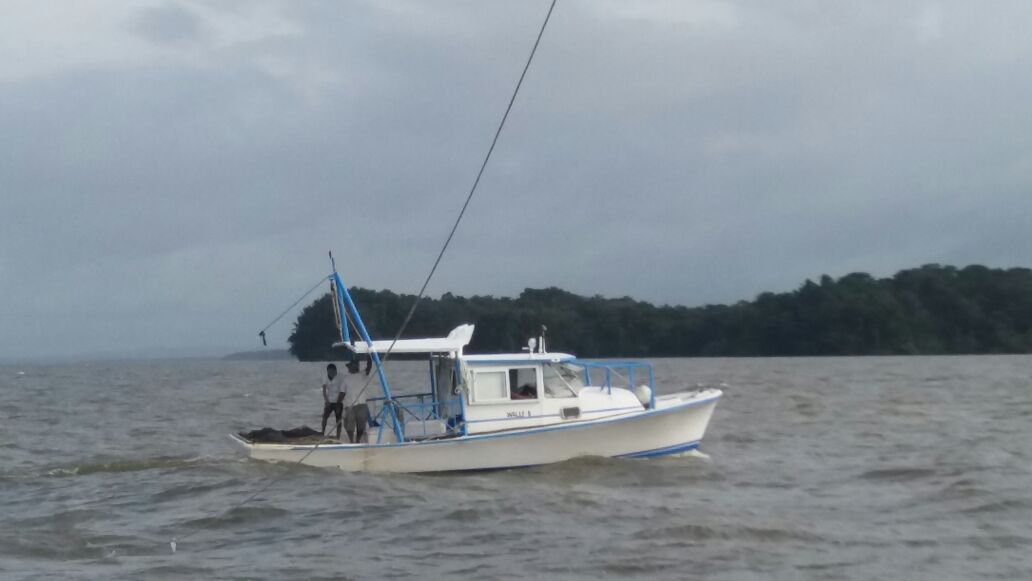 Am nächsten Nachmittag bei Hochwasser: Ein Lotsenboot gibt uns Schlepphilfe, damit wir die flache Mündung des Rio Dulce durchfahren können.