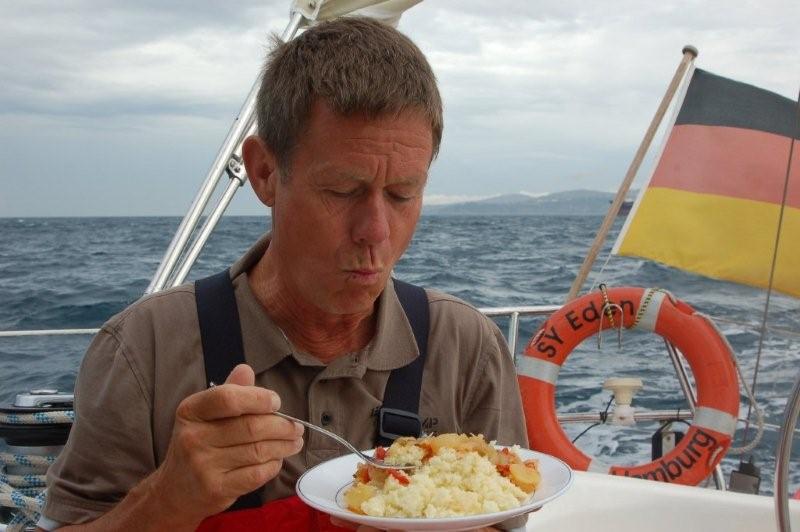 Auf dem Weg nach Rabat: der Käpt´n kostet das erste Mal Couscous und es schmeckt ihm!