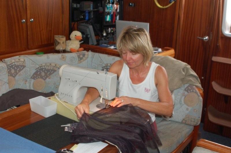 Nähende Bordfrau - wir brauchen passende Netze, um die Flussmücken nicht reinzulassen!