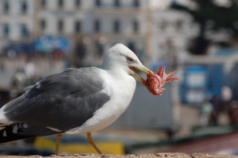 Gefräßige Möwe mit Fischkopf - die Seevögel halten den Hafen von Abfällen frei...