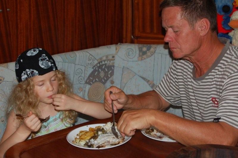 Opapa hat echt Glück, er kriegt die Hälfte der lecker gebratenen Brasse ab!